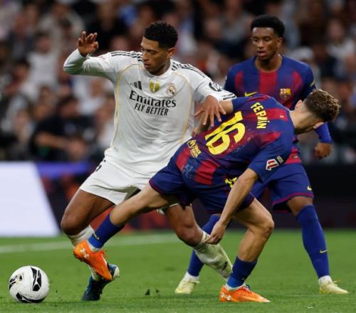 比赛从第22分钟便进入高潮,贝林厄姆一记精准直传撕开防线,姆巴佩反越位成功推射单刀破门,为皇马点燃主场气氛。巴萨不甘示弱,很快扳平比分,16分钟后,曼联旧将拉什福德禁区回做,费尔明・洛佩斯跟进推射扳平比分,攻防转换间尽显豪门底蕴。