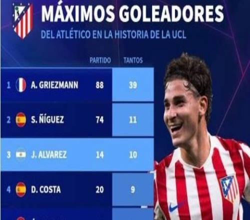 马竞队史欧冠进球榜:格列兹曼39球居首,小蜘蛛10球位列第三